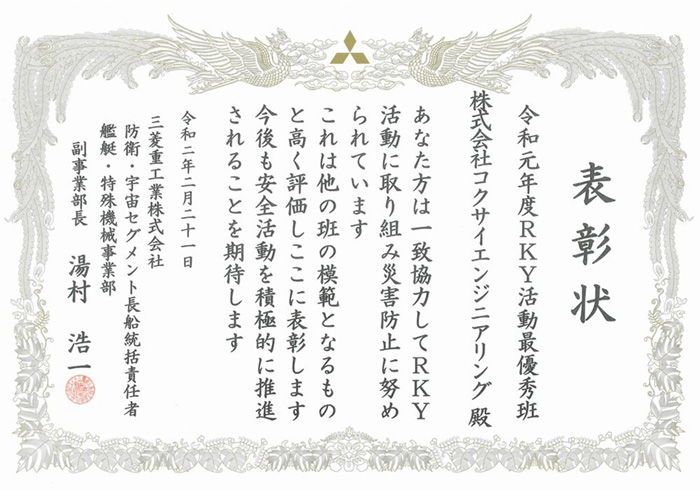 立神艦船製造部 令和元年度 RKY活動最優秀賞(3年連続)